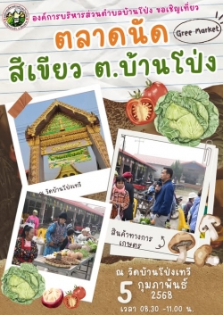 ตลาดนัดท้องถิ่นสีเขียวตำบลบ้านโป่ง เชิญเลือกชื้อสินค้าชุมชน โดยชุมชน เพื่อชุมชน วันที่ 5 พฤศจิกายน 2568 เวลา 08.00 - 10.00 น. ณ วัดบ้านโป่งเทวี