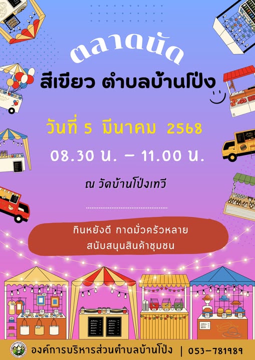 กาดนัดสีเขียวตำบลบ้านโป่ง 5 มีนาคม 2568 วันนี้ตอนนี้ 08.30 - 10.30 น. ณ วัดบ้านโป่ง